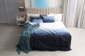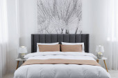 Zdjęcie "Komfortowa sypialnia z obrazem na dekoracyjnej ścianie. Projekt wnętrza" może być wykorzystywane do celów osobistych i komercyjnych zgodnie z warunkami zakupionej licencji Royalty-free. Obraz jest dostępny do pobrania w jakości wysokiej rozdzielczości do 5760x3840.