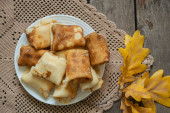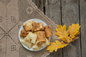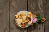 zawinięte naleśniki na talerzu na śniadanie są na stole w kuchni, naleśniki na śniadanie
