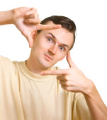 portret młodzieńca zaskoczony gestykulacji.