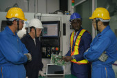 przemysłowe tło pracowników fabryki i technika noszącego maskę do ochrony koronawirusa covid-19 z kamizelką bezpieczeństwa i hełmem posiadającego szczegółowy opis pracy od brygadzisty fabryki w sterowni