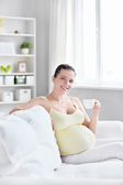 piękna kobieta w ciąży pić herbatę i czytać magazyn na tak