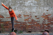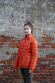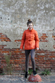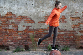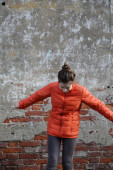 Śmieszne aktywne nastolatek gitl przeciwko czerwonej cegły ściany zewnątrz. Wybrane skupienie.