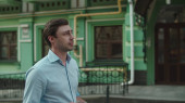 Młoda para uśmiecha się w zwolnionym tempie na ulicy. Miłość para patrząc na siebie