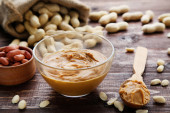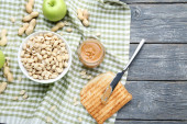 Masło orzechowe z chlebem i orzechami na brązowym drewnianym stole
