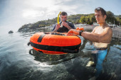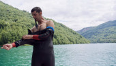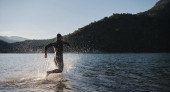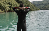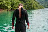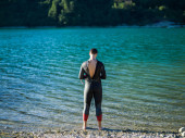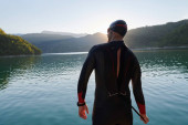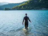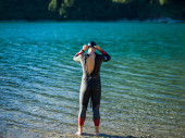 triathlon sportowiec przygotowuje się do treningu pływackiego na jeziorze