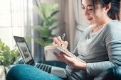 Zdjęcie "Praca w domu, Close-up młoda profesjonalna kobieta rozmawia przez telefon komórkowy i za pomocą laptopa, businesswoman pracy z domu za pośrednictwem komputera przenośnego." może być wykorzystywane do celów osobistych i komercyjnych zgodnie z warunkami zakupionej licencji Royalty-free. Obraz jest dostępny do pobrania w jakości wysokiej rozdzielczości do 5760x3840.