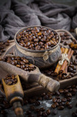 kawa, paluszki cynamonowe i przyprawy na brązowej drewnianej desce 1