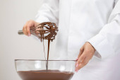 Zbliżenie co organiczne ręcznie robione czekolady, wylewanie ciemno stopionej czekolady