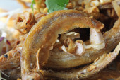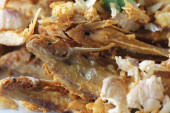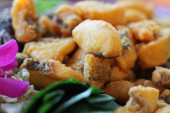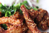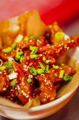 Pyszne hot Deep Fried kurczaka wieprzowina z dodatkiem sezamu ozdobione smażone zioło w restauracji dla smakoszy, tła reklamy żywności