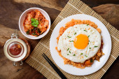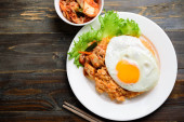 Tajskie jedzenie, Mieszać smażoną wieprzowinę z bazylią i jajkiem smażonym na gotowanym ryżu jedząc z chili w sosie rybnym (Pad Kaprao Moo Kai Dao)