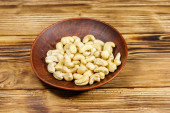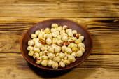 Orzechy laskowe obrane w szklanej misce na drewnianym stole. Widok z góry