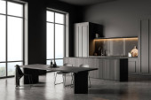Zdjęcie "Nowoczesna kuchnia w czarno-białym marmurze z wyspą i stolcami - renderowanie 3d" może być wykorzystywane do celów osobistych i komercyjnych zgodnie z warunkami zakupionej licencji Royalty-free. Obraz jest dostępny do pobrania w jakości wysokiej rozdzielczości do 5760x3840.