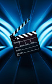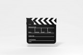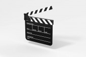 Klapa i taśma filmowa z ciemnym tłem, renderowanie 3D. Cyfrowy rysunek komputera.