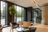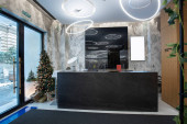 Zdjęcie "Wnętrze hotelowego lobby z recepcją z przezroczystymi pleksiglasami przezroczystymi strażnikami kichającymi" może być wykorzystywane do celów osobistych i komercyjnych zgodnie z warunkami zakupionej licencji Royalty-free. Obraz jest dostępny do pobrania w jakości wysokiej rozdzielczości do 5760x3840.