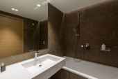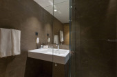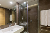 Zdjęcie "Wnętrze łazienki hotelowej z kabiną prysznicową" może być wykorzystywane do celów osobistych i komercyjnych zgodnie z warunkami zakupionej licencji Royalty-free. Obraz jest dostępny do pobrania w jakości wysokiej rozdzielczości do 5760x3840.