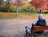 Moskwa. Rosja. 3 października 2020 roku siwa starsza kobieta w czerwonej kurtce siedzi zamyślona pod drzewem na ławce w parku. Słoneczny jesienny dzień. Spadek liści w parku miejskim.