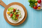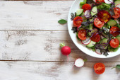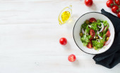 Zdjęcie "Świeża mieszanka zielonych liści, pomidorów, awokado i sałatki ogórkowej na białym, drewnianym tle. Leżeć płasko. Przestrzeń kopiowania" może być wykorzystywane do celów osobistych i komercyjnych zgodnie z warunkami zakupionej licencji Royalty-free. Obraz jest dostępny do pobrania w jakości wysokiej rozdzielczości do 5760x3840.