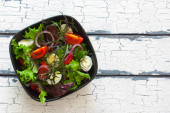 Świeża mieszanka zielonych liści, pomidorów, awokado i sałatki ogórkowej na białym, drewnianym tle. Leżeć płasko. Przestrzeń kopiowania
