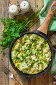 Zdrowe śniadanie lub dietetyczny lunch. Omlet jajeczny z kalafiorem w żeliwnej patelni na lekkim kamiennym blatze stołu. Przestrzeń kopiowania.