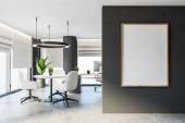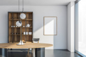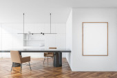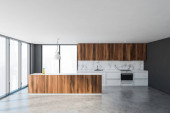 Wnętrze nowoczesnej kuchni z szarymi i drewnianymi ścianami, marmurową podłogą i barem ze stołkami. Pionowy plakat makiety. 3d renderowanie