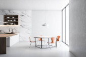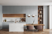 Zdjęcie "Wnętrze nowoczesnej kuchni z szarymi i drewnianymi ścianami, marmurową podłogą i barem ze stołkami. Pionowy plakat makiety. 3d renderowanie" może być wykorzystywane do celów osobistych i komercyjnych zgodnie z warunkami zakupionej licencji Royalty-free. Obraz jest dostępny do pobrania w jakości wysokiej rozdzielczości do 5760x3840.
