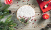 Kobieta trzyma świąteczny biały mus ciasto pokryte płatków kokosowych imitujących śnieg i ozdobione czerwonymi jagodami, szyszki i gałązki jodły. Koncepcja Nowego Roku i Bożego Narodzenia.