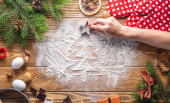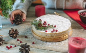 Kobieta trzyma świąteczny biały mus ciasto pokryte płatków kokosowych imitujących śnieg i ozdobione czerwonymi jagodami, szyszki i gałązki jodły. Koncepcja Nowego Roku i Bożego Narodzenia.