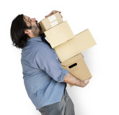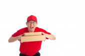 Mężczyzna w niebieskiej koszulce z kartonowym pudełkiem na głowie robi gest dłońmi odizolowanymi na białym tle.