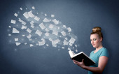 bardzo młoda kobieta, czytanie książki, podczas gdy kolorowe linie są comin
