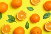 Dojrzałe słodkie mandarynki na niebieskim tle, widok z góry