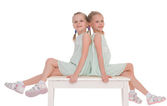 Dwie małe dziewczynki pozujące w studio na białych kostkach