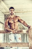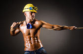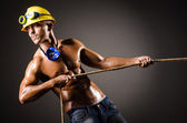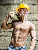 atrakcyjny mięśni ręczne pracownik przystojny z kasków ochronnych