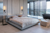 Elegancka sypialnia z podwójnym łóżkiem, tapetą winylową i balkonem za ścianą okna