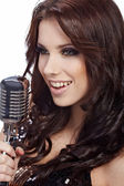 czarujący dziewczynka gospodarstwa mikrofon i śpiew