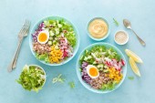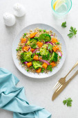 Wegetariańska quinoa i brokuły ciepła sałatka z pieczonym dyni lub dyni, zielony groszek i świeża czerwona cebula, widok z góry na dół