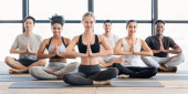 Medytacja grupowa. Sportowy Wielorasowy Mężczyźni i Kobiety medytujący razem podczas zajęć jogi