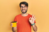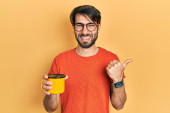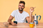 Młody Hiszpan pijący włoską kawę z uśmiechem na twarzy. wykazujące zęby.