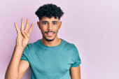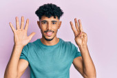 Zdjęcie "młody arabski człowiek noszenie casual biały t koszulka pokazując i wskazując palcem numer dziesięć, uśmiechając się pewny siebie i szczęśliwy. " może być wykorzystywane do celów osobistych i komercyjnych zgodnie z warunkami zakupionej licencji Royalty-free. Obraz jest dostępny do pobrania w jakości wysokiej rozdzielczości do 5760x3840.