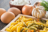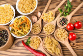 różnych rodzajów makaronów z pieczarkami i pomidorkami