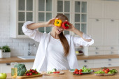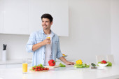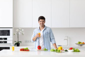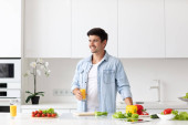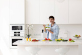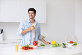 Młody człowiek gotuje w nowoczesnej kuchni, przygotowuje śniadanie. Zdrowe i pyszne jedzenie.