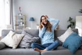 Zdjęcie "Młoda rudowłosa kobieta siedząca na nowoczesnym krześle i ciesząca się porankiem w domu. Miłego weekendu." może być wykorzystywane do celów osobistych i komercyjnych zgodnie z warunkami zakupionej licencji Royalty-free. Obraz jest dostępny do pobrania w jakości wysokiej rozdzielczości do 5760x3840.