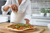 Zbliżenie rąk szefa kuchni, dodanie żółtych pomidorów do pizzy. Wegańskie.