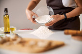 Zbliżenie na rękach kucharza z garścią białej mąki. Na stole jest drewniana deska z rozproszoną mąką.