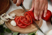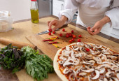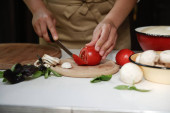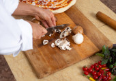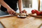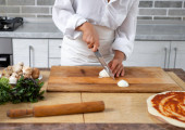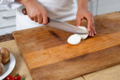 Zbliżenie, kucharz zaczyna kroić cebulę na krążki nożem.