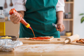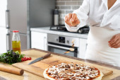 Widok rąk szefa kuchni krojenie grzybów na drewnianej planszy.