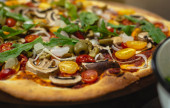 Zdjęcie "Widok rąk szefa kuchni siekającego na drewnianej desce pomidorami wiśniowymi z żółtym nożem. Gotowanie pizzy wegańskiej." może być wykorzystywane do celów osobistych i komercyjnych zgodnie z warunkami zakupionej licencji Royalty-free. Obraz jest dostępny do pobrania w jakości wysokiej rozdzielczości do 5760x3840.