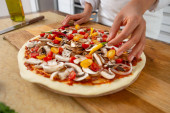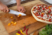 Widok rąk szefa kuchni siekającego na drewnianej desce pomidorami wiśniowymi z żółtym nożem. Gotowanie pizzy wegańskiej.