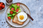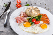 Zdjęcie "Angielskie śniadanie. Jajka smażone z grzybami i szynką ze szklanką soku pomarańczowego na śniadanie. Dzień dobry.." może być wykorzystywane do celów osobistych i komercyjnych zgodnie z warunkami zakupionej licencji Royalty-free. Obraz jest dostępny do pobrania w jakości wysokiej rozdzielczości do 5760x3840.