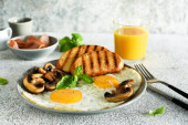 Angielskie śniadanie. Jajka smażone z grzybami i szynką ze szklanką soku pomarańczowego na śniadanie. Dzień dobry..