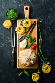 Makaron z sosem pesto, bazylia i orzechy sosnowe. Włoskie jedzenie. Widok z góry.